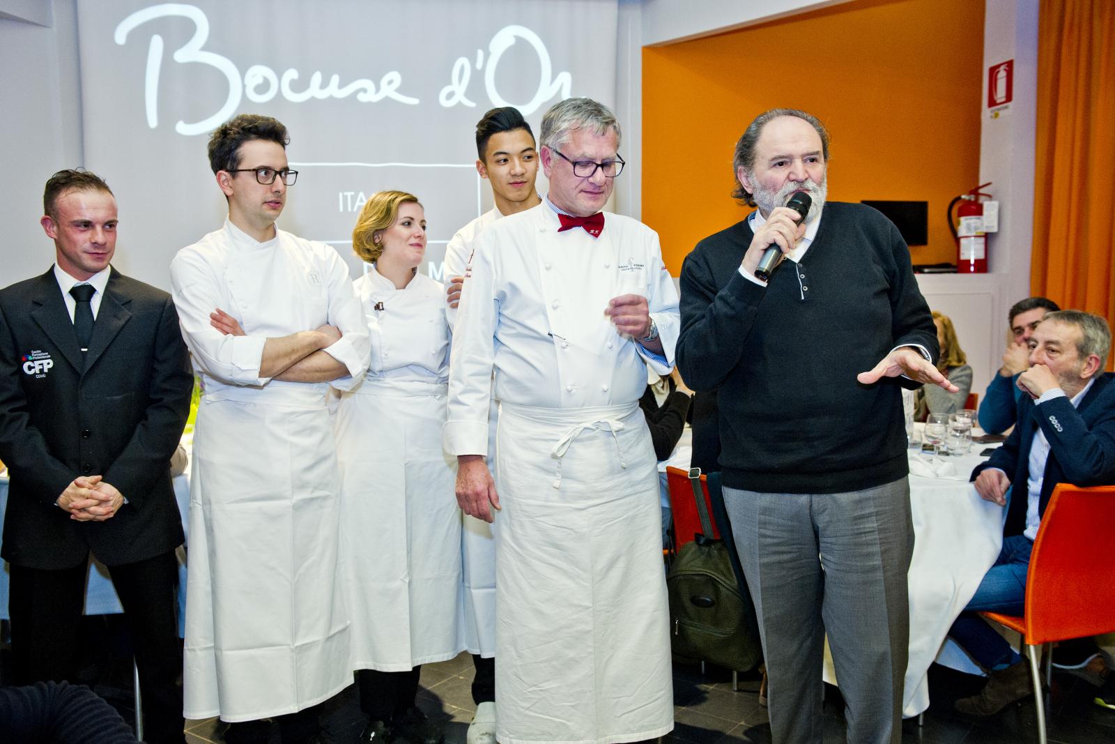 Photo Gallery Home Photo Gallery GRANDI CHEF AL CFP - BERNARD FOURNIER ed EDOARDO SAVINO (CENA A 4 MANI) GRANDI CHEF AL CFP - BERNARD FOURNIER ed EDOARDO SAVINO (CENA A 4 MANI) Importante appuntamento per le Serate dei grandi chef al Centro di Formazione Professionale della Provincia di Como. Lunedì 11 febbraio ospiti d’onore Bernard Fournier, chef patron dello stellato “Da Candida” di Campione d’Italia ed Edoardo Savino, executive chef del Ristorante "Conte Rossini - La Moderna Trattoria Italiana", nuovo ristorante dell’ Hotel Melià di Campione, la cui concezione è stata guidata proprio da Fournier in collaborazione con Luciano Tona, direttore del Bocuse d’Or Italia. La cucina di Tona ha preso spunto dalle collaborazioni con Gualtiero Marchesi per poi orientarsi verso uno stile polimorfico. Dopo essere stato Direttore di Alma, la celebre scuola internazionale di cucina italiana di Colorno, dal 2016 è direttore di Accademia Bocuse d’Or Italia, presieduta da Enrico Crippa, celebre ex allievo del CFP, chef del tre volte stellato Ristorante “Piazza duomo” di Alba. Bernard Fournier, francese di nascita e italiano per amore, con la moglie Adriana Berti ha gestito l’Orso Grigio a Trento, dove ha iniziato a diffondere la cultura e la conoscenza del Foie Gras. Nel 1992 ha acquisito il Ristorante Da Candida a Campione d’Italia che è stato il primo ad ottenere la stella Michelin in provincia di Como. Edoardo Savino è un giovane e talentuoso cuoco, Diplomato ad Alma nel 2017, che ha iniziato a collaborare con Fournier durante il suo tirocinio di formazione. Il sodalizio tra i tre illustri rappresentanti dell’alta cucina si ripropone per la serata al CFP che li vedrà interpreti di un menu molto ricercato. L'articolazione della serata ha visto un ricco e ricercato menu con alta qualità delle materie prime (tartufo nero, foglia d'oro e faraona su tutte), grande lavorazione dei piatti e servizio di alto livello. Protagonisti come sempre anche gli allievi del CFP: le quarte annualità dei corsi di cucina hanno avuto la grande opportunità di affiancare gli chef nella realizzazione dei piatti mentre gli studenti di sala si sono occupati del servizio e dell’accoglienza degli ospiti, con la guida del loro docente e dei professionisti del Ristorante “Da Candida”. Qui di seguito la Gallery dell'evento e la premiazione degli Chef da parte dello staff del CFP (Crediti fotografici Carlo Pozzoni) Torna indietro Condividi Su E-mailFacebookTwitterLinkedIn Gallery