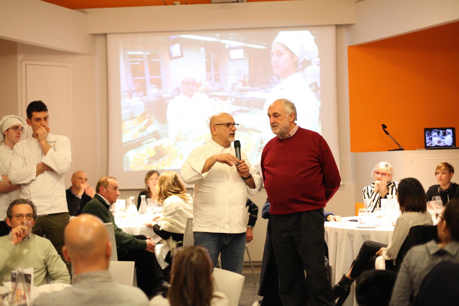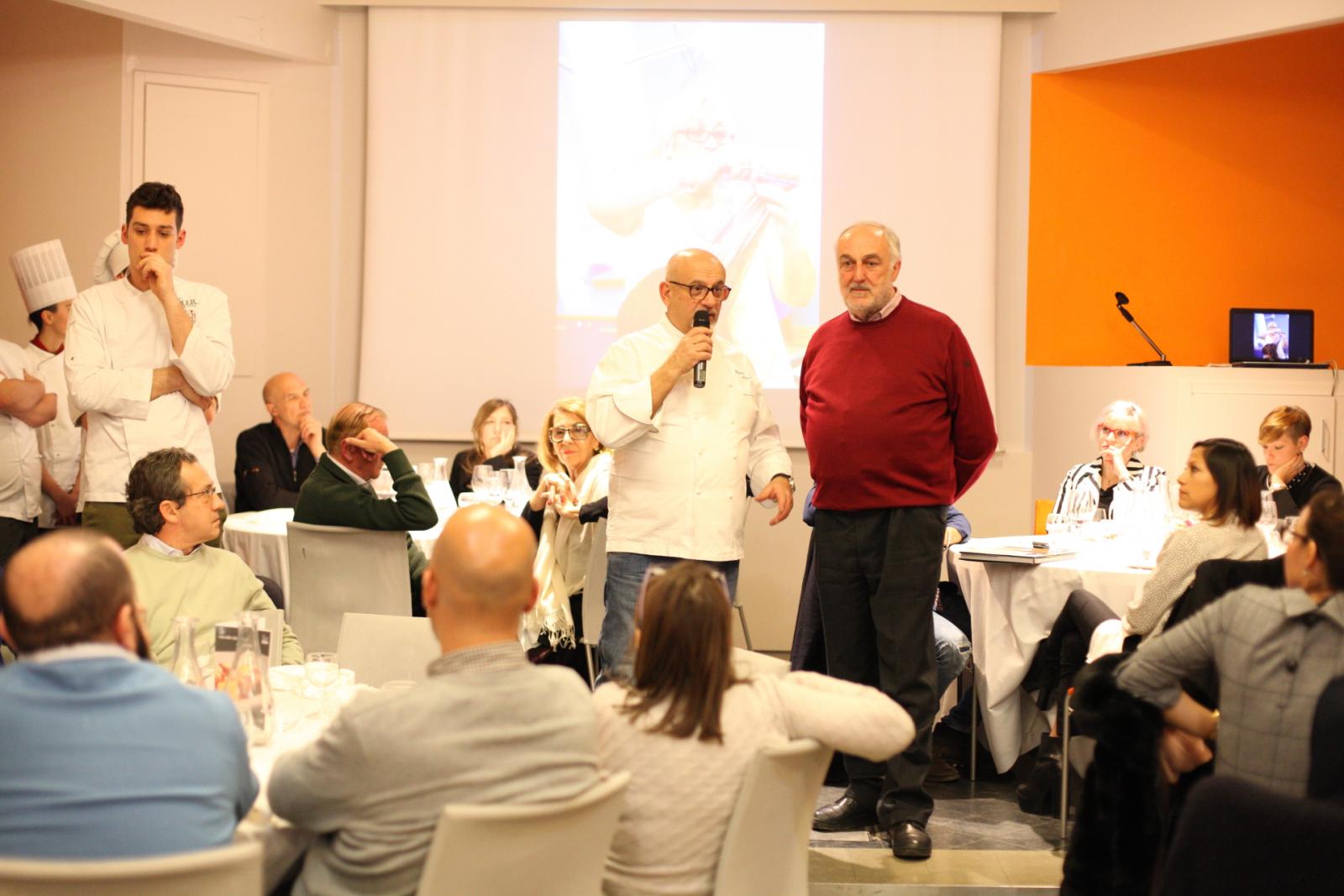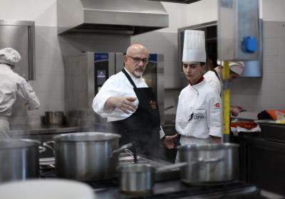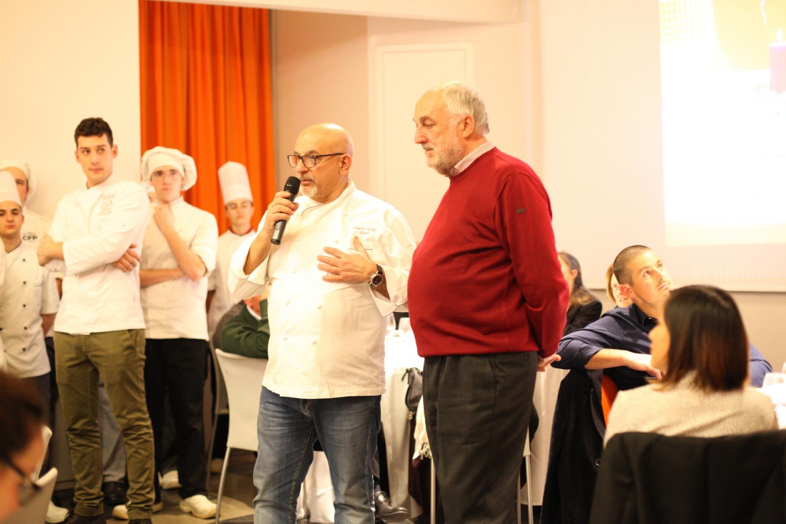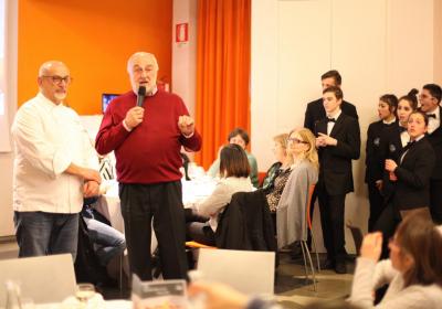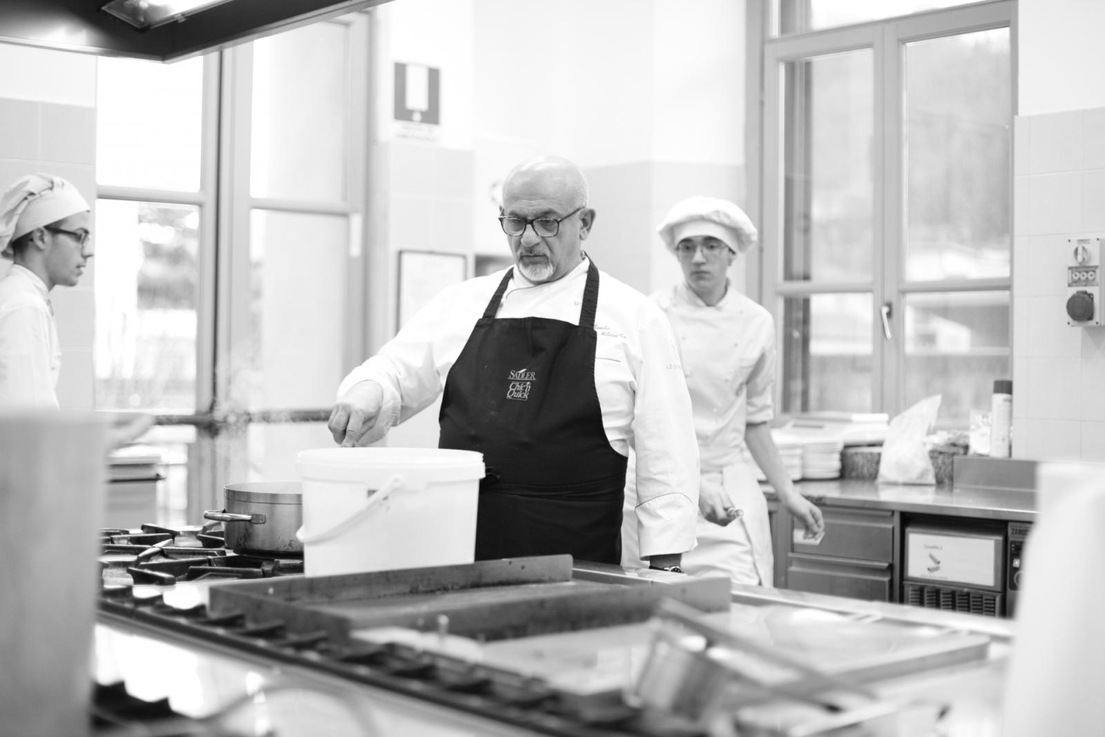 Photo Gallery Home Photo Gallery GRANDI CHEF AL CFP: CLAUDIO SADLER GRANDI CHEF AL CFP: CLAUDIO SADLER Un importante serata ha visto protagonista il CFP di Como in data 8 marzo per l'appuntamento annuale "La Rassegna dei Grandi Chef", con ospite d'eccezione il cuoco Claudio Sadler, stellato Michelin, del "Ristorante Sadler" di Milano. Sadler, uno degli Chef più conosciuti in Italia, propone una cucina creativa e raffinata abbinando una razionale applicazione delle regole ad una esemplare creatività, senza dimenticare un singolare amore per l’innovazione. La stessa innovazione si ritrova anche nelle strumentazioni utilizzate in cucina, sempre all’avanguardia e in continua modernizzazione. La serata propone un menù degustazione – nella piena tradizione della ristorazione top gourmet – indicata per ospiti esigenti e raffinati intenditori. Il Menu, di gran classe, parte da una Tatin di carciofi mozzarella all'olio d'acciuga, prosegue con Fregola sarda allo zafferano ragù di polpo e tocco di peperoncino e - come secondo piatto Filetto di vitello con salsa di funghi trombetta patate nocciolate Per concludere lo Chef propone un Semifreddo caffè bianco cremoso alla fava tonka e gel al rhum. Ciascuna delle quattro portate è accompagnata da un diverso vino in abbinamento, al fine di esaltare i sapori dei singoli piatti. Il Centro di Formazione Professionale di Como – una realtà che opera ormai da più di quaranta anni nella Formazione Professionale (Settore Ristorativo Alberghiero e del Benessere) può contare anche sulla collaborazione dei suoi allievi più meritevoli appartenenti alle Quarte Annualità di Cucina e Sala Ristorante, che hanno lavorato con lo Chef in cucina e con la sala per il Servizio per i numerosi ospiti, che in questa edizione hanno superato le ottanta persone. Gli allievi hanno accompagnato la serata che ha consentito loro di crescere dal punto di vista professionale e personale completando l’ideale acquisizione di avanzate competenze tecnico professionali. Al termine della serata, Direzione e ragazzi del CFP hanno conseganto un libro fotografico di Como: "Ville e giardini del Lago", omaggiando la cena con un piccolo regalo per la professionalità e la disponibilità dimostrata anche nel pomeriggio, quando lo Chef ha tenuto una breve conferenza sul Settore della Ristorazione e sull'Alta Ristorazione nel territorio Lombardo. Sadler è stato inoltre uno dei fondatori dell’Associazione “Jeunes Restaurateurs d’Europe”, e svolge consulenza gastronomica professionale per diverse aziende e per riviste del settore. È stato presidente dei ristoratori milanesi e compare tra i ristoranti nella prestigiosa guida dell’associazione “Le Soste”, di cui dal marzo 2012 è il presidente. Apre il suo primo locale a Pavia nel 1982, quella che fu la “Locanda Vecchia Pavia” e in contemporanea, durante i periodi estivi, gestisce il ristorante Vela Blu a Portisco in Costa Smeralda. Nel 1986 aprirà “Osteria di Porta Cicca” di Ripa di Porta Ticinese a Milano, dove, nel 1991 verrà insignito della sua prima stella Michelin. Contemporaneamente all’attività del ristorante si dedica all’insegnamento e nel 2002 crea “Q.B. centro di cucina enogastronomico” dove insieme ad altri validi insegnanti organizza corsi per professionisti e appassionati. Nel 2008 Sadler approda a Pechino ed in piazza Tien’anmen apre il suo ristorante coadiuvato da due validi collaboratori. Dopo anni di brillante carriera sui Navigli milanesi, Sadler si trasferisce in via Ascanio Sforza 77, a pochi numeri civici di distanza dal precedente locale. Il suo nuovo ristorante ha aperto nel settembre 2007, affiancato da un secondo locale, Chic’n Quick, per una ristorazione più informale e veloce, ma sempre nello stile del grande chef, e che, per le occasioni, accoglie banchetti ed eventi. Qui di seguito gli scatti più belli dell'evento Torna indietro Condividi Su E-mailFacebookTwitterLinkedIn Gallery